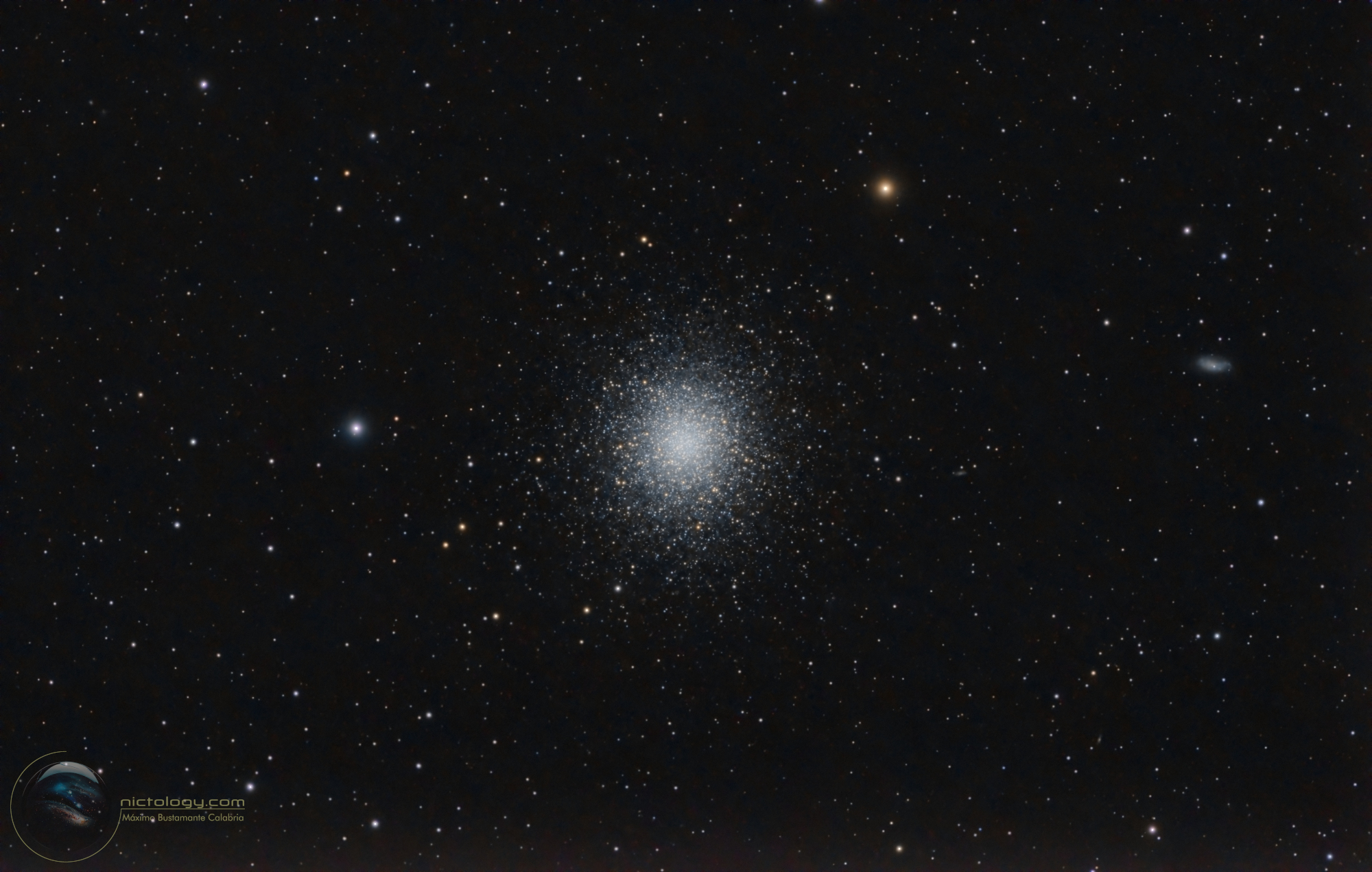 M13 es el cúmulo globular más conocido entre los aficionados a la astronomía. En condiciones óptimas de oscuridad es perceptible a simple vista en la constelación de Hércules y su distancia es de 25.100 años luz. Además del cúmulo se pueden apreciar en el campo varias galaxias débiles: cerca del borde derecho de la imagen está NGC 6207, una espiral a 39 millones de años luz, y más cerca del cúmulo (aunque más débil y difícil de percibir) IC 4617, a 503 millones de años luz.