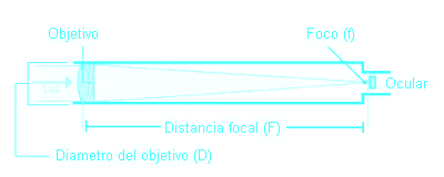 Los objetos que queremos observar en el cielo nocturno son por regla general muy débiles (excepto la luna y los planetas) y la abertura del tubo óptico es una de las características determinantes para la finalidad de este instrumento, de modo que a mayor diámetro más luz captará y mejor se podrán observar objetos débiles y difusos como nebulosas y galaxias. Por eso el primer dato de un telescopio en el que nos debemos fijar es el diámetro de su objetivo, que será lo que nos condicione hasta dónde podemos llegar tanto en luminosidad como en aumento. El segundo dato a considerar es la distancia focal del objetivo: no es lo mismo si el conjunto de lentes o espejos forma la imagen a 400, 952 o 2000 mm. Al igual que en los objetivos de las cámaras fotográficas, a mayor distancia focal menos campo abarcaremos y más oscura será la imagen. La luminosidad de nuestro telescopio vendrá condicionada tanto por el diámetro como por la distancia focal del objetivo, siendo su cociente (distancia focal/diámetro) o razón focal el indicador de cuán luminoso es. Por ejemplo, un tubo óptico de 127 mm de diámetro y 952 mm de distancia focal tendrá una relación focal de 7.5, y es menos luminoso que uno de la misma abertura y 600 mm de focal, que tendrá un valor de 4.72. Esto hay que tenerlo especialmente en cuenta en la astrofotografía de cielo profundo, donde lo ideal es trabajar con telescopios de baja relación focal (más luminosos).
