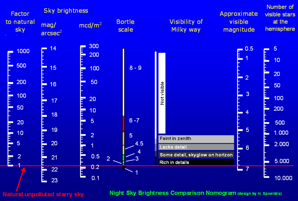 Para que sean visibles las estrellas y otros cuerpos celestes, su luminosidad debe contrastar con el fondo del cielo, y esto significa que a medida que aumenta el brillo del fondo un número cada vez mayor de objetos dejan de verse. Como consecuencia, en muchas ocasiones podemos encontrar que el brillo del cielo se describe con una magnitud límite que es el umbral a partir del cual no se puede distinguir los objetos menos brillantes y, por tanto, a su vez se asocia al número de objetos con un determinado brillo que son visibles. El nomograma de brillo del cielo de Spoelstra (que se muestra a continuación) ilustra de forma muy clara las diferentes unidades de medida obtenidas a partir de los distintos métodos para estimar el brillo del cielo, recogiendo los valores equivalentes de una escala respecto a las otras. Además de las métricas ya mencionadas, se encuentran el grado de visibilidad de La Vía Láctea o la escala de Bortle, donde el valor 1 corresponde a cielos muy oscuros y 8-9 a cielos urbanos. La línea roja horizontal corresponde a un cielo estrellado sin contaminación lumínica donde sólo existe el brillo natural del cielo, cuyo valor es de 21.7 mag/arsec2 o 1 en la escala de Bortle, e implica poder ver en detalle la Vía Láctea así como contemplar unas 6000 estrellas hasta una magnitud aparente de 6.9.