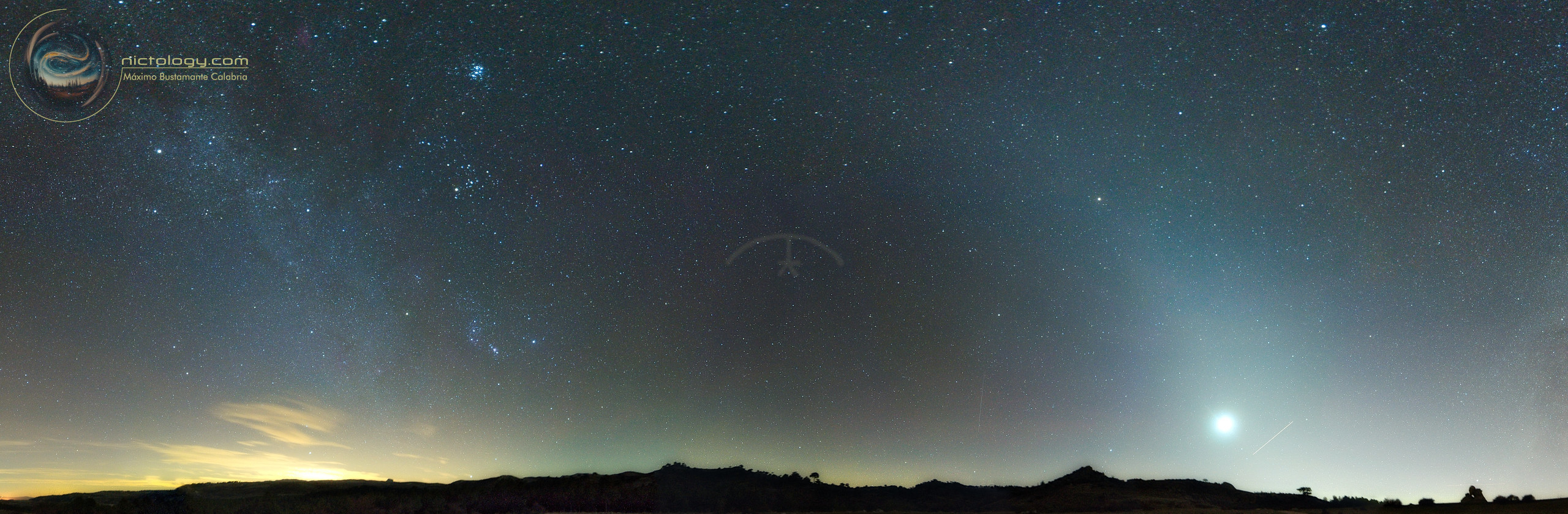 Las imágenes panorámicas permiten conseguir una visión con un campo mayor del que se podría obtener con cualquier gran angular, y además con una resolución elevada que hacen posibles ampliaciones e impresiones en papel. Una de las posibilidades que ofrecen es sacar el arco completo de la Vía Láctea entre los meses de mayo y julio, cuando comienza a ganar altura sobre el horizonte. La técnica consiste básicamente en disparar desde un punto varias fotografías con idénticos parámetros variando únicamente el ángulo horizontal (el azimut) y con suficiente superposición entre ellas para que se puedan unir con un software apropiado. Dicho así parece algo sencillo, pero hay que tener una serie de consideraciones en cuenta para que el resultado sea bueno, sobre todo cuando se trata de imágenes nocturnas, pues la misma dificultad inherente a la fotografía nocturna la tendremos con una panorámica en idénticas condiciones. Componer una panorámica nocturna tiene dos fases igual de importantes: el proceso de obtención de las tomas en campo y el procesado. El material necesario es una cámara (que permita un control completamente manual de la toma), un trípode estable dotado de una rótula con nivel de burbuja y un disparador a distancia.