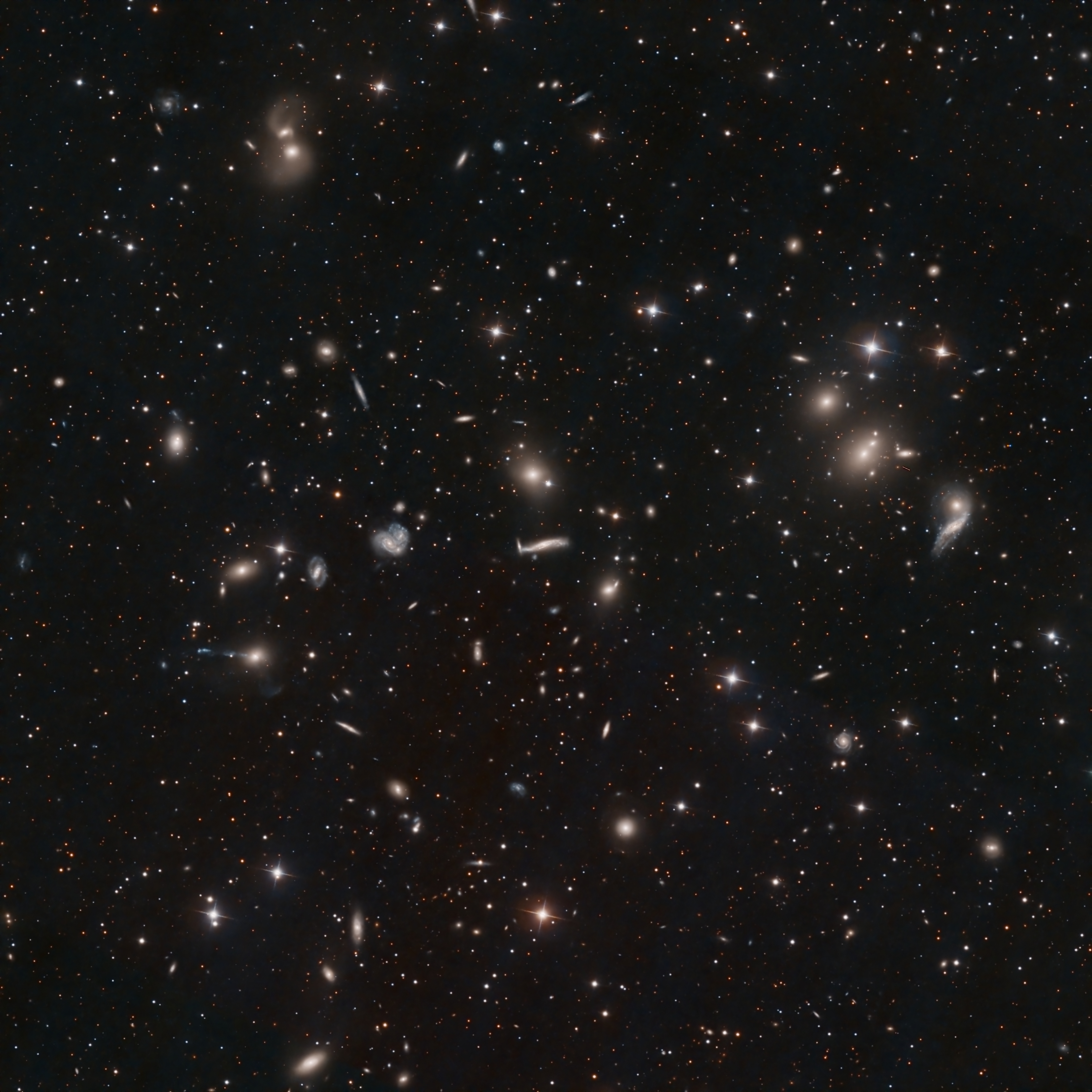 Si examinamos detenidamente esta imagen se puede apreciar una gran variedad de galaxias de diferentes aspectos (elípticas, espirales y lenticulares), y sobre todo llama la atención que muchas de ellas se encuentran interactuando como si bailaran un tango cósmico, lo que ha dado lugar a esas caprichosas formas ocasionadas por los tirones gravitatorios. La imagen siguiente corresponde a una fracción de la primera y en ella se puede apreciar la gran diversidad de morfologías galácticas. En el centro destacan dos galaxias espirales en una fase inicial de colisión, que ya han entrado en contacto a través de sus brazos (NGC 6050 e IC 1179). Destaca también en la parte inferior izquierda IC 1182, una galaxia activa tipo Seyfert que muestra un jet claramente visible en el rango óptico y unas bandas de polvo que cruzan el núcleo. Seguramente estamos asistiendo a una fusión de galaxias que ya ha activado el agujero negro central de una de ellas gracias a un nuevo aporte de materia. En el resto del campo vemos espirales barradas, espirales con estructuras en anillo, elípticas, lenticulares, etc., todo un zoo galáctico en unos minutos de arco.