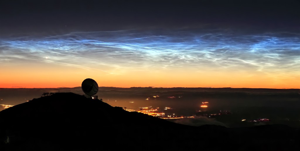 Las nubes noctilucentes, también conocidas como nubes mesosféricas polares, son un curioso fenómeno meteorológico visible después del anochecer en latitudes cercanas a los polos (entre 50 y 70º al norte y sur del Ecuador). Su aspecto filamentoso nos puede recordar a las nubes altas, pero se diferencian en que se forman a una altura de 80 kilómetros y no son visibles a plena luz del día. Sólo se aprecian cuando -una vez ha oscurecido y es prácticamente de noche- permanecen aún iluminadas por el Sol, cuya luz se refleja en los cristales de hielo confiriéndoles un extraño color azul eléctrico sobre la oscuridad del firmamento.
