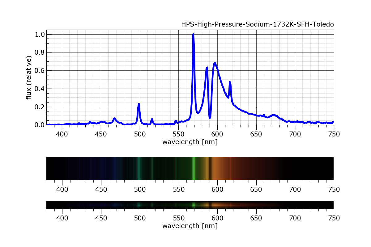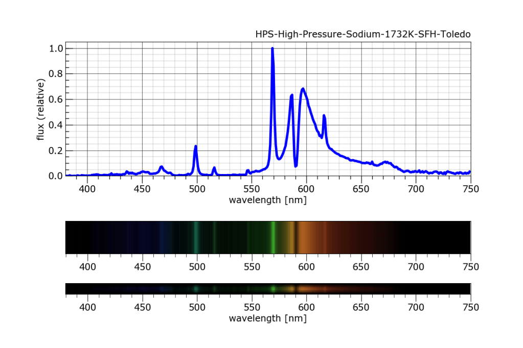 Por otro lado están las lámparas de vapor de sodio, que pueden ser a baja o a alta presión. El vapor de sodio a alta presión (VSAP) produce una luz cálida anaranjada característica, pues su emisión se produce mayormente del verde al rojo con pequeños picos en el azul. Ha sido la lámpara por excelencia del alumbrado público y sigue estando presente en nuestros pueblos y ciudades, aunque cada vez menos. El vapor de sodio a baja presión (VSBP) es la mejor lámpara desde el punto de vista ambiental y de la eficiencia, pues emite una luz prácticamente monocromática amarillo-anaranjada. No en vano ha sido la utilizada en los lugares cercanos a observatorios astronómicos internacionales con el máximo grado de protección del cielo nocturno, pero desgraciadamente no ha sido frecuente verla en el alumbrado público de nuestros pueblos y ciudades por su baja reproducción cromática.