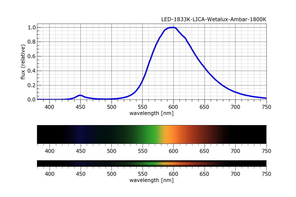 - LED ámbar de 1800 K. Es un LED que apenas emite en azul y con muy buena reproducción cromática, lo que hace difícil entender que no sea el usado de forma general en el alumbrado público como sustituto del VSAP. ¿Será porque los fabricantes tenían que deshacerse del stock de 4000 K?