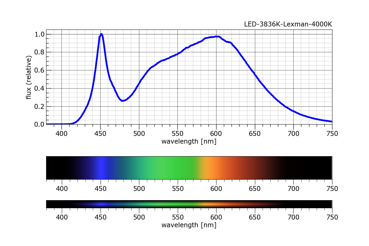 Frente a las lámparas de descarga, las de tecnología LED (basada en diodos emisores de luz) produce una luz de espectro continuo que abarca todo el visible y con un importante pico en el azul. El resultado es una luz blanca azulada muy fría, aunque ya se fabrican LED que incorporan un filtro de fósforo que absorbe parte del azul y le da un aspecto más cálido. Incluso algunos modelos llegan a asemejarse bastante al vapor de sodio, como es el caso los LED PC ámbar o los Ámbar Puro. Sin embargo los que se están instalando masivamente son de luz fría (4000 K) o un mal llamado blanco cálido (3000 K). Además el ahorro energético ha llevado a la mayoría de administraciones locales a incrementar los niveles de iluminación de forma totalmente injustificada, o con argumentos sin base científica como el de la seguridad ciudadana vinculada supuestamente a más iluminación nocturna. Sin embargo, la gran versatilidad de los LED no es aprovechada para diseñar y gestionar una iluminación de forma más racional. A continuación se incluyen algunos espectros de lámparas LED ordenados de mayor a menor emisión de luz azul. Se puede observar que incluso los de 3000 K, muy usados y que son llamados «de luz cálida», tienen un pico de emisión en azul nada despreciable.