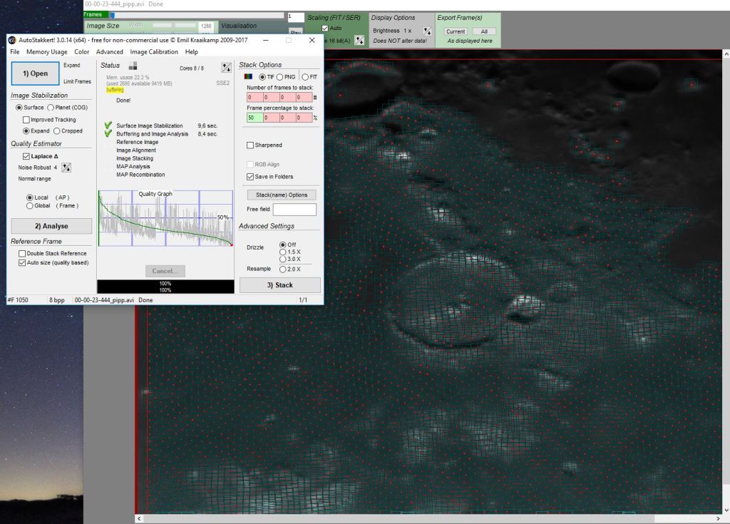 Una vez que tenemos todos nuestros archivos de vídeo unidos en uno (correspondientes a un filtro), y con los fotogramas analizados y ordenados por calidad, el siguiente paso es seleccionar los mejores, alinearlos y apilarlos en una imagen. Esto se puede hacer por ejemplo con el programa AutoStakkert (https://www.autostakkert.com/). Con este programa abrimos el archivo de vídeo generado por PIPP, y una vez analizado cada fotograma establecerá una retícula de puntos para alinear y apilar los mejores. El resultado será una imagen sobre la que trabajaremos para realzar los detalles.