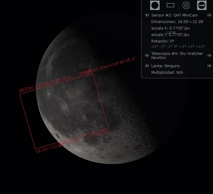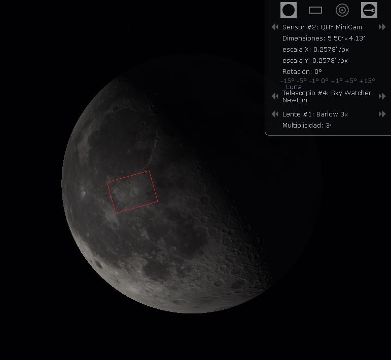 Debemos empezar teniendo claro el campo que abarcaremos, dependiente de la distancia focal total con la que trabajemos y el tamaño del sensor de la cámara. Una forma de tener una idea es con el programa Stellarium, que permite introducir los datos de nuestro equipo y representar el área del cielo que abarcaremos. En las siguientes imágenes está dibujado el campo que podemos captar en la Luna con mi equipo, primero con la cámara a foco primario y a continuación con una lente barlow x3.
