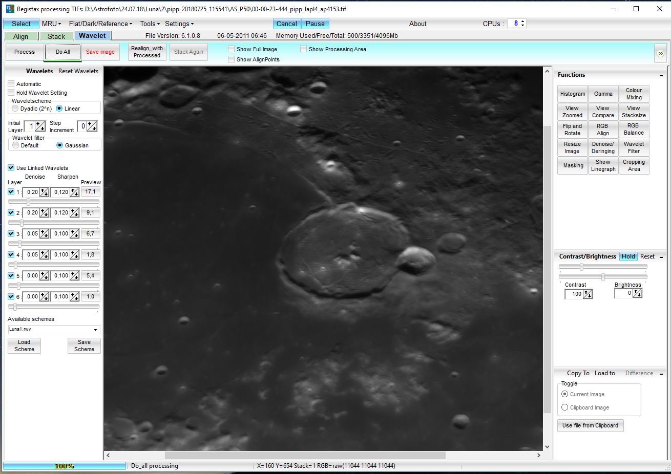 Por último utilizaremos el programa RegiStax (https://www.astronomie.be/registax/), uno de los más famosos en astrofotografía planetaria, o bien su versión actualizada WaveSharp. Realmente todos los pasos anteriores también se pueden hacer con este software, pero yo al menos he obtenido mejores resultados haciéndolo tal y como lo he expuesto. RegiStax es una herramienta muy buena para mejorar la nitidez de los detalles trabajando con wavelets. En las capturas de pantalla siguientes se puede comprobar el cambio que opera en la imagen apilada tras ajustar un poco las tres primeras capas, que corresponden a las estructuras más pequeñas. Hay que tener en cuenta que un exceso de enfoque puede generar ruido y artefactos, por lo que se debe hacer con cuidado. Si los datos de partida no son buenos (porque apenas tengamos fotogramas de calidad en los vídeos que hemos capturado) no podemos esperar milagros; ahora, si se han producido momentos de estabilidad en la imagen es posible llegar a una nitidez y detalle sorprendentes.
