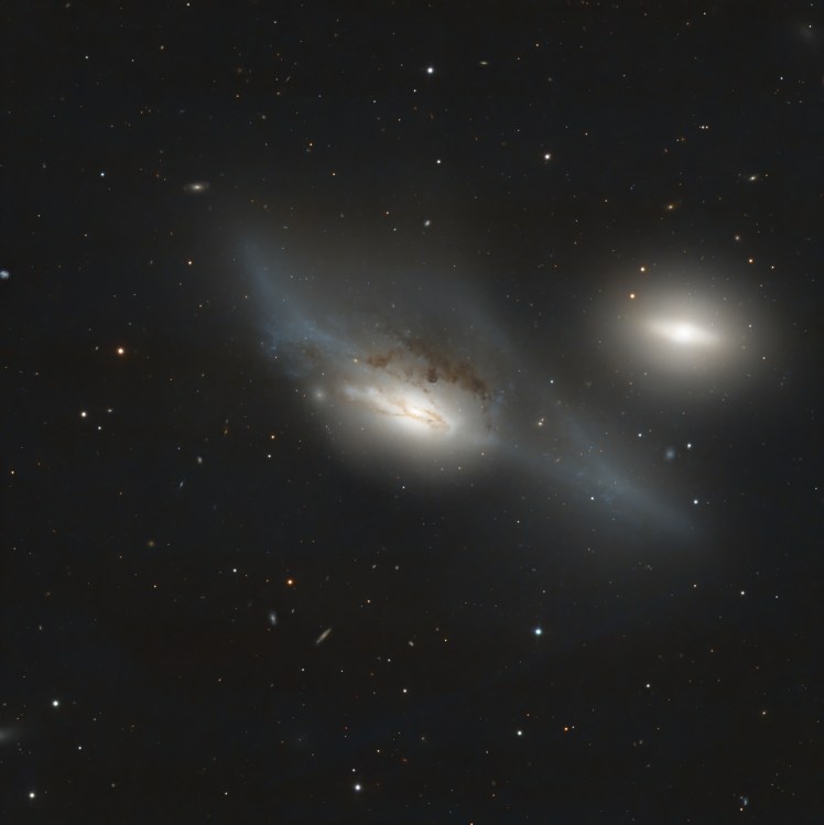 En la constelación de Leo, y a unos 77 millones de años luz, se encuentra esta pareja formada por una galaxia espiral (NGC 3227, arriba en la fotografía) y una elíptica enana (NGC 3226) que se encuentran en proceso de colisión. Tanto NGC 3227 como NGC 3226 son fuentes de radio y rayos X, y concretamente NGC 3227 ha sido caracterizada como una galaxia de tipo Seyfert.