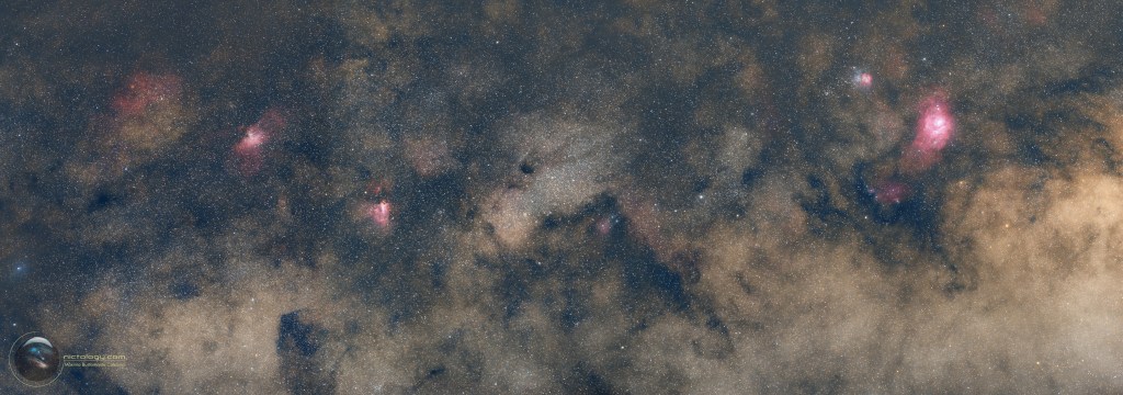 En la astrofotografía de cielo profundo aparecen objetos que requieren de largas exposiciones, y por tanto un seguimiento preciso. Puede ser de gran campo o estar centrada en algún objeto, y se pueden usar desde objetivos fotográficos a telescopios. Es necesario un procesado bastante complejo. La galería está agrupada en las siguientes categorías: gran campo profundo, nebulosas, galaxias, cúmulos de estrellas y cometas. Los últimos los incluyo porque, aunque sean objetos del Sistema Solar, su procesado es similar al del cielo profundo. Para saber algo más de cada imagen o verla a tamaño completo pulsa sobre el símbolo de información.